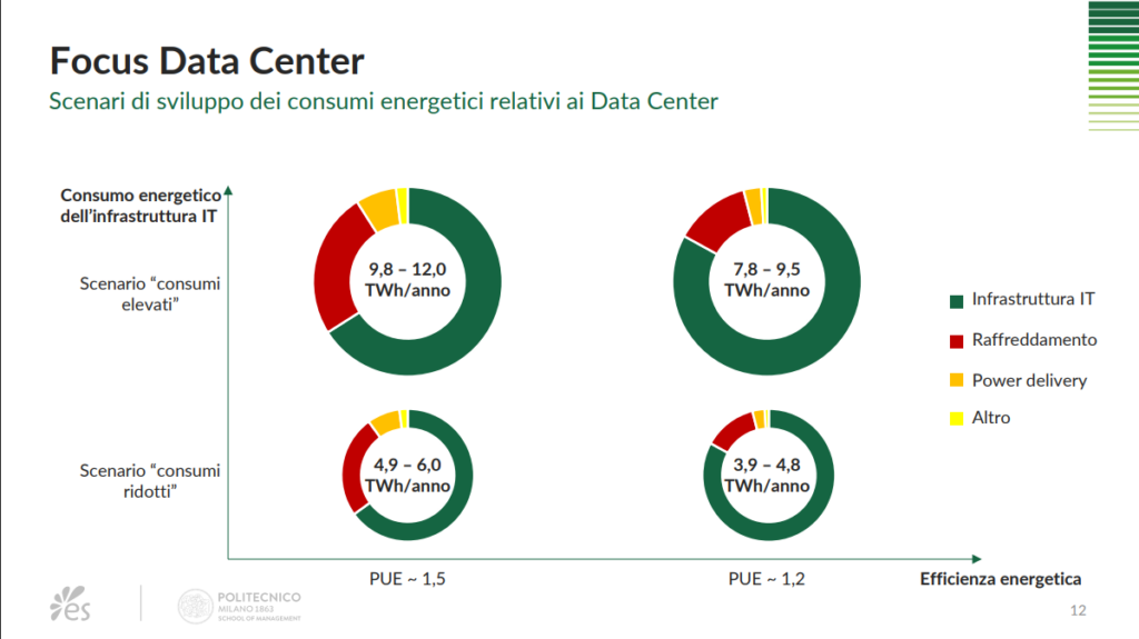 In caso di consumi elevati, ad esempio, con un tasso di efficienza energetica Pue pari a 1,5 avremo un range di consumi (prevalentemente legati all’infrastruttura It) di 9,8-12 TWh all’anno. Nel caso di consumi ridotti e un livello Pue di 1,2 si stimano invece consumi energetici compresi tra 3,9 e 4,8 terawattora all’anno.