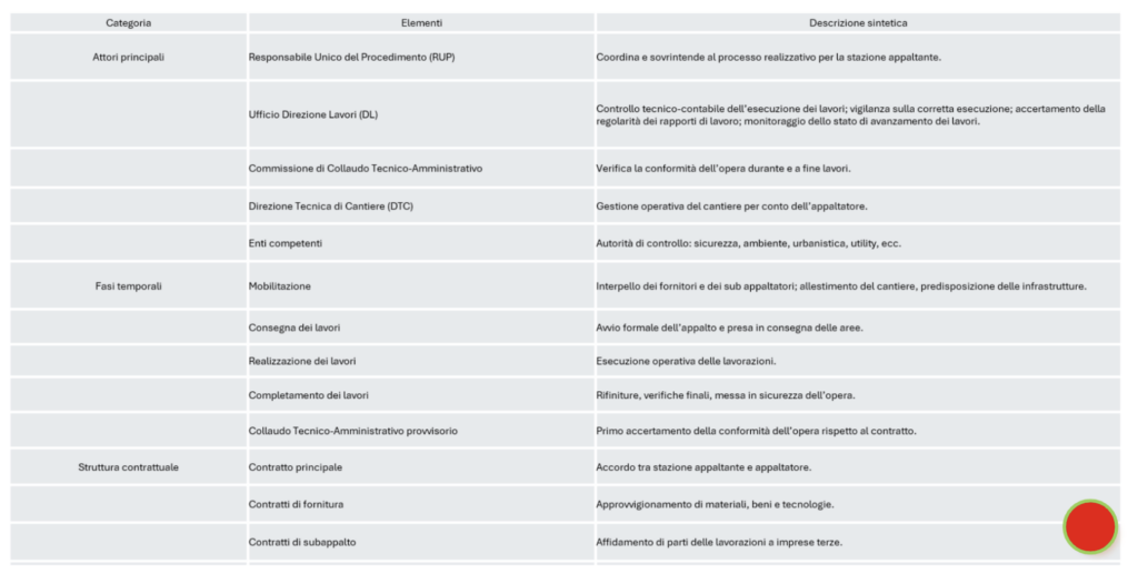 - la natura degli attori principali (responsabile unico del procedimento, ufficio di direzione dei lavori, commissione di collaudo tecnico amministrativo in corso d’opera, direzione tecnica di cantiere, enti competenti);