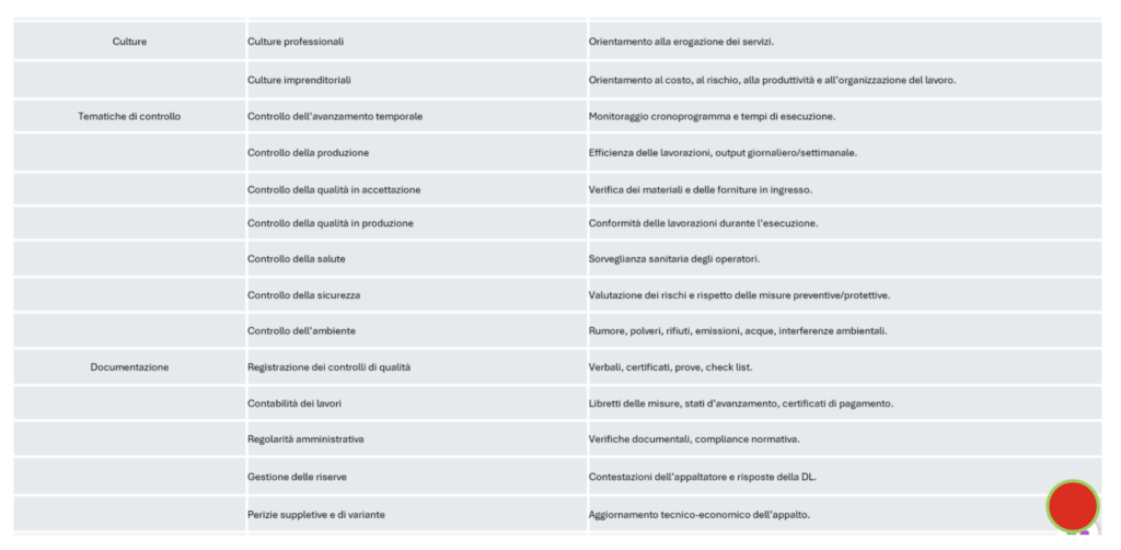 - le tematiche (controllo dell’avanzamento temporale, controllo della produzione, controllo della qualità in accettazione, controllo della qualità in produzione, controllo della salute, controllo della sicurezza, controllo dell’ambiente);