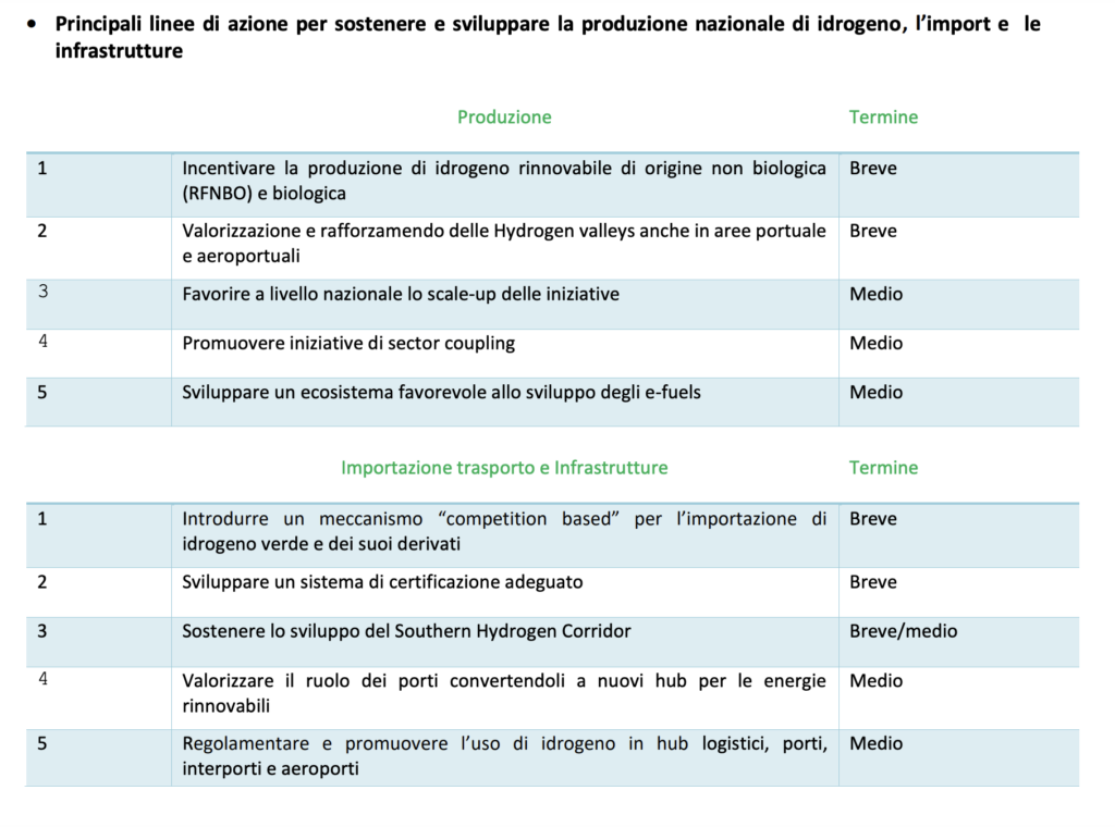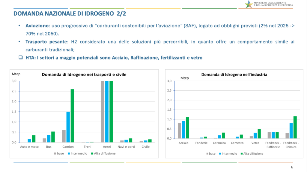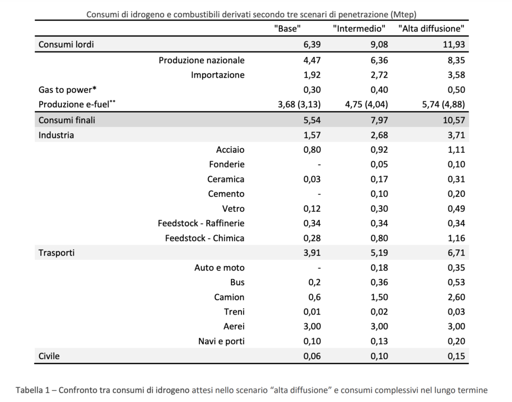 Un focus particolare riguarda i trasporti per i quali, “sempre analizzando lo scenario alta diffusione, i consumi finali di idrogeno (considerando sia idrogeno puro sia e-fuels) sono stimati in circa 6,71 Mtep, corrispondenti a una quota superiore al 30% dei consumi finali dei trasporti al 2050; tale valore sarebbe trainato dal comparto aereo (3,0 Mtep), con valori in tale ambito non lontani dal 70% dei consumi ipotizzati, seguito dal segmento dei trasporto pesante (2,6 Mtep), con una quota ipotizzata pari a circa il 32%, riconducibile all’ipotesi di una maggior competizione con altre soluzioni tecnologiche basate sull’elettrificazione e sull’impiego di biocarburanti”.