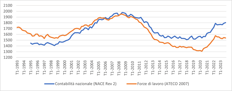 Se analizziamo i dati delle due fonti notiamo che per la Rilevazione della Forza Lavoro gli occupati in costruzioni nel quarto trimestre 2023 i sono 1.537.000; mentre per la Contabilità Nazionale le unità di lavoro sono 1.804.000. La differenza tra le due fonti è di 267.000 unità di lavoro in più rispetto agli occupati della Forza Lavoro. Non solo: per la contabilità nazionale le unità di lavoro negli ultimi due trimestri salgono; gli occupati diminuiscono. Inoltre se proiettiamo la serie di dati su un periodo di tempo lungo, notiamo come dal 1993 al 2004 gli occupati della Forza lavoro -come dovrebbe essere- sono di più delle unità di lavoro, nel periodo 2005-2010 le due fonti sono in linea; dal 2011 in poi le cose si sono rovesciate e la forbice tra le due voci è andata allargandosi. Tema interessante ma non oggetto di questa nota.