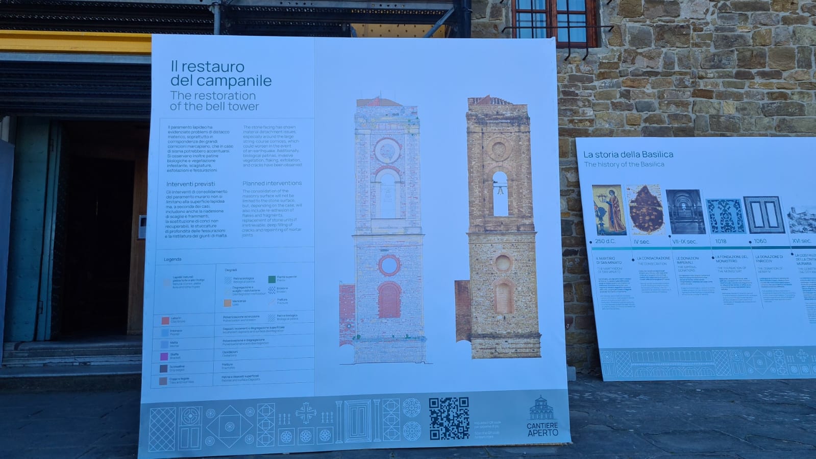Il lato nord della chiesa, situato a sinistra e vicino al possente campanile, presenta una serie di dissesti e segni di rifacimenti murari che raccontano una storia di secoli di assestamenti strutturali. L’attuale campanile, pesante e solenne, sopra il quale Michelangelo posizionò i cannoni per difendere Firenze dai francesi, fu ricostruito nel XVI secolo su un terreno poco stabile. Questa massiccia costruzione portò a nuovi assestamenti che hanno inciso sulla stabilità delle murature perimetrali della Basilica e delle volte della cripta sottostante. Si leggono lesioni e fuoripiombo nella parete nord, a cui nell’800 si cercò di porre rimedio inserendo il contrafforte tuttora esistente. Il dissesto è lento, ma ancora attivo. Per questo, l’intervento prevede di inserire due tiranti per migliorare la stabilità e la resistenza sismica della struttura.