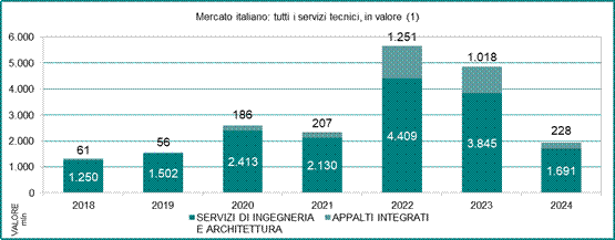Nel 2024 sono andati in gara 1.918,8 milioni di euro totali (1.691 per servizi puri e 228 in appalti integrati) contro i 2.413 milioni del 2020 e i 2.130 milioni del 2021 (-17,9%). La riduzione rispetto agli anni del Pnrr è del 66% rispetto al 2022 e del 56% rispetto al 2023. Sul dato 2024 pesa anche l’incertezza da equo compenso: il chiarimento portato dal correttivo (anche in fase preliminare) può spiegare in parte il miglioramento di dicembre, con un dato quasi tre volte quello di novembre. Lupoi: “Avevamo previsto si sarebbe andati sotto i due miliardi, il correttivo è un’occasione persa se si fa eccezione per l’equo compenso e i requisiti che si possono di nuovo acquisire in dieci anni”.