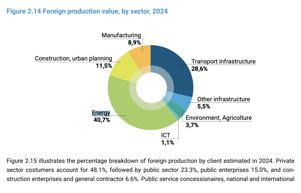 Come mostra il grafico, i settori che domineranno all’estero in termini di produzione anche quest’anno sono l’energia e le infrastrutture di trasporto. Dal punto di vista dimensionale, invece, le aziende con oltre 500 dipendenti hanno una quota di produzione estera dell’88% (dati sul 2023), quota che scende al 17,3% per le imprese da 11-25 impiegati.