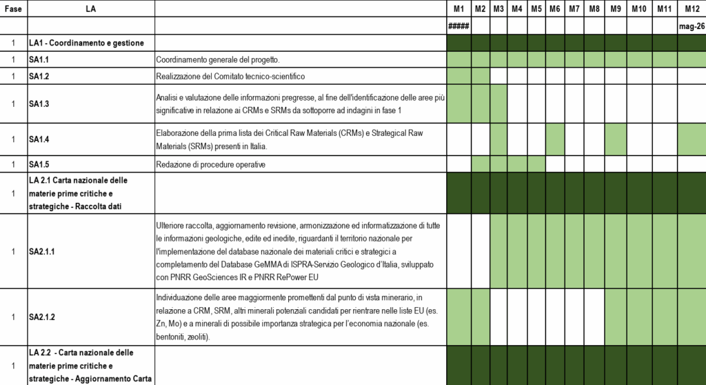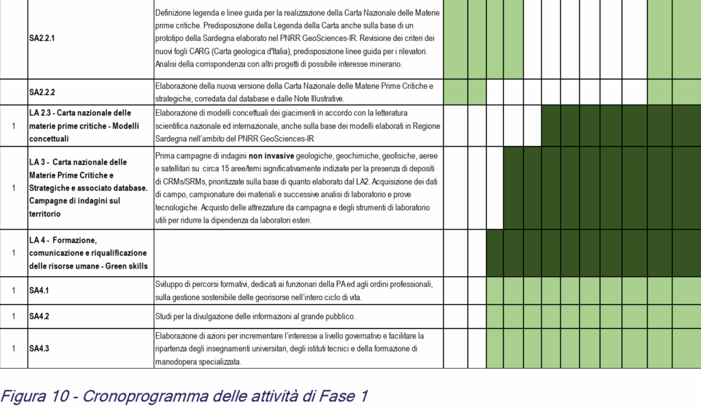 La Fase 3, eventuale, è prevista invece per il biennio giugno 2028/maggio 2030 e sarà dedicata alla finalizzazione, ed eventuale approfondimento di quanto eseguito in Fase 1 e 2 ed espansione della ricerca nelle aree limitrofe o in altre aree di interesse, anche tenendo conto della possibile variazione della lista dei materiali critici per l’Ue. I finanziamenti di Fase 2 e 3 – spiega il documento – potranno essere stabiliti anche sulla base dei risultati, auspicabilmente favorevoli, di Fase 1. Le tre fasi si articolano in 4 specifiche Linee di Attività: Coordinamento e gestione che sarà operativa sia in Fase 1 che in Fase 2 e 3; Carta nazionale delle materie prime critiche, dedicata all’implementazione del data base minerario ed articolata in ulteriori tre Sotto Azioni. Carta nazionale delle materie prime critiche, campagne di indagini: dedicata all’implementazione del data base minerario attraverso indagini di campagna; Formazione, comunicazione e riqualificazione delle risorse umane – Green skills: dedicata alla formazione del personale ed alla disseminazione dei risultati.