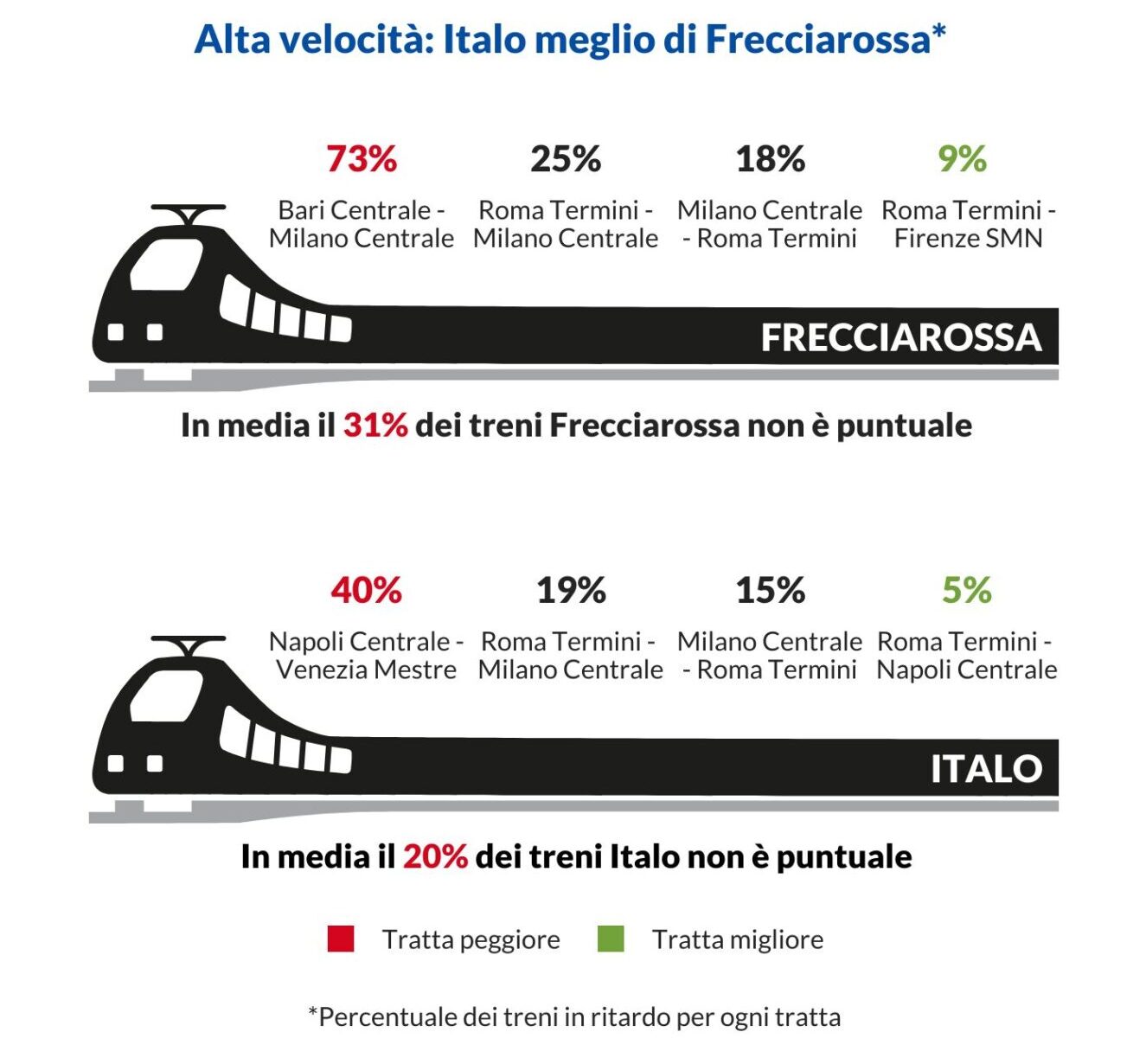 Italo mostra una performance migliore sulla media delle tratte esaminate: in ritardo è il 20% dei suoi convogli. Le tratte più critiche per Italo sono Napoli Centrale-Venezia Mestre, con ritardi nel 40% dei casi, e Reggio Calabria Centrale-Roma Termini, con ritardi al 38%. Sulla Milano Centrale-Roma Termini i treni Italo registrano ritardi nel 15% dei casi da Milano (19% nel verso opposto). Sul confronto diretto delle tratte monitorate in comune, Italo risulta in media di poco più puntuale: 20% di ritardi contro il 26% dei Frecciarossa.