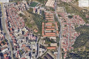 L’area demaniale comprende un’ex città militare con 12-13 edifici abbandonati di dimensioni medio-grandi (nella foto aerea è la zona colorata di verde), costruita su una collina accerchiata da due baraccopoli, Bisconte e Camaro San Luigi (perimetrate di rosso), che contano in tutto 300 manufatti.