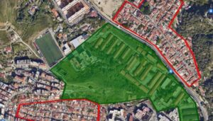 L’area demaniale comprende un’ex città militare con 12-13 edifici abbandonati di dimensioni medio-grandi (nella foto aerea è la zona colorata di verde), costruita su una collina accerchiata da due baraccopoli, Bisconte e Camaro San Luigi (perimetrate di rosso), che contano in tutto 300 manufatti.
