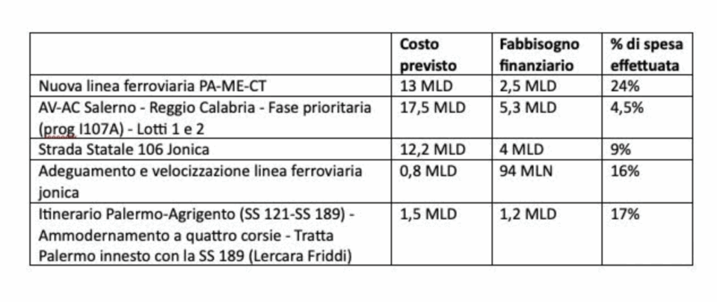 Il segretario confederale della Cgil sottolinea che “basta leggere il recente rapporto sulle opere strategiche infrastrutturali della Camera dei Deputati (Silos) per vedere che per quelle di Calabria e Sicilia programmate e in corso di realizzazione ad oggi mancano risorse per un ammontare di 18 miliardi, di cui oltre 8 per le opere ferroviarie e 10 per strade e autostrade. Allo stesso tempo – conclude – occorre un forte impegno politico e tecnico per realizzare le tante opere in corso, molte delle quali registrano rallentamenti preoccupanti, mentre le imprese denunciano difficoltà a reperire manodopera specializzata”.
