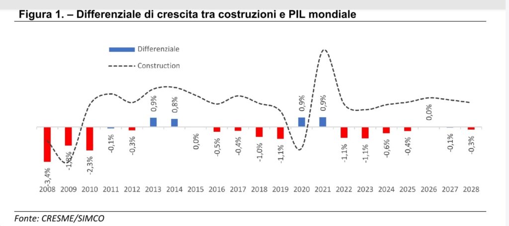L’impennata dei costi di produzione, le condizioni restrittive dal lato del credito e la crisi immobiliare in Cina, Europa e Nord America hanno pesato sulla crescita degli investimenti nel biennio appena passato. Nel corso del 2024, inoltre, si è aggiunto un ulteriore fattore: l’esaurimento delle generose politiche di stimolo fiscale che avevano sostenuto l’edilizia in alcuni Paesi europei, Italia in primo piano. Come conseguenza, secondo gli ultimi aggiornamenti di Cresme/SIMCO ed Euroconstruct , l’anno dovrebbe chiudersi con una crescita degli investimenti totali del +2,1%, una dinamica significativamente inferiore a quella stimata per il PIL mondiale (+2,7% tra i 150 Paesi inclusi nel database SIMCO). Se confermato, questo dato rappresenterebbe il quarto peggior tasso di crescita degli ultimi 25 anni. Inoltre, considerando le previsioni più recenti, alla fine del 2028 le costruzioni mondiali potrebbero essere cresciute a un ritmo inferiore a quello generale per sette anni di fila, la serie più lunga dal 2000 a oggi (si veda la Figura 1 in appendice).