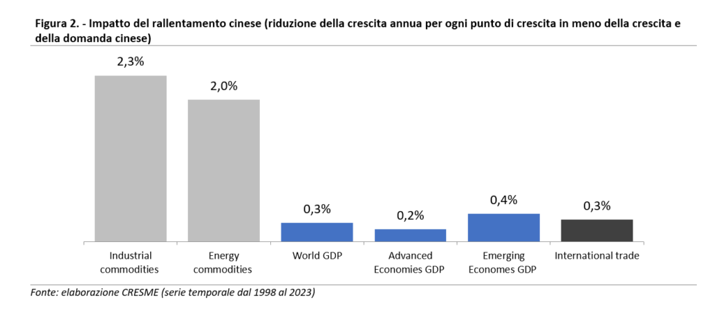 Veniamo quindi alla Cina. In base alle ultime stime del Cresme, nel 2024 il mercato del nuovo residenziale cinese è calato, a valori reali, del -2%; calo che arriva dopo il -5,4% del 2022 e il -3,6% dell’anno passato. In altri termini, rispetto al livello raggiunto nel 2021, in tre anni il settore abitativo di Pechino ha bruciato quasi 233 miliardi di euro (valutati ai prezzi del 2023), in pratica, quasi due volte tutto il mercato residenziale italiano. Per farsi un’idea delle implicazioni di questi numeri, si consideri che, nella media degli ultimi quattro anni, real-estate e investimenti residenziali hanno contribuito al 12% del prodotto interno lordo di Pechino; in altri termini, un calo del 10% del settore abitativo pesa sulla crescita economica cinese per 1,2 punti percentuali. Si tenga presente che ogni punto percentuale di minore crescita in Cina innesca un calo dei prezzi delle materie prime, energetiche e industriali, superiore a due punti percentuali, riduce la crescita degli scambi internazionali di beni e servizi per 0,3 punti percentuali e rallenta la crescita del PIL mondiale di 0,3 punti percentuali (Figura 2 in appendice).