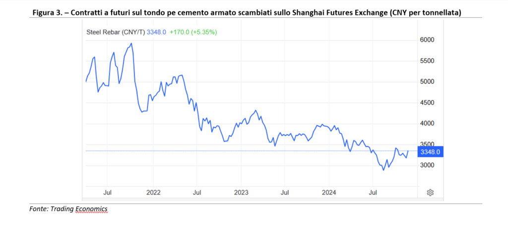 Tra i fattori che hanno portato alla difficile situazione attuale, vi è l’incapacità delle autorità di Pechino di mettere in atto azioni tempestive ed efficaci, come dimostrato dalla mancanza di una strategia di lungo termine e dai continui cambi di rotta. Come detto, nel 2020, la prima “vera” azione del Governo è stata l’introduzione delle cosiddette “tre linee rosse”. L’obiettivo era ridurre la leva finanziaria, tranquillizzare i mercati azionari e favorire una crescita settoriale più sostenibile, ma col solo risultato di generare una crisi di liquidità e una serie di dolorosi fallimenti. Nel 2021, allarmato dalla possibilità di un contagio sistemico, il Governo ha intensificato le misure di controllo, limitando ulteriormente l’accesso al credito e monitorando le attività finanziarie delle compagnie più indebitate. Nel 2022, riconoscendo la gravità della situazione, le autorità hanno introdotto le prime misure di supporto al mercato, tra cui l’estensione dei termini di rimborso dei prestiti e l’allentamento delle regole sugli acconti richiesti agli acquirenti. Nel 2023, nonostante il proseguo della crisi di liquidità del settore, il Governo ha mantenuto una postura rigida, evitando di introdurre misure di sostegno ai developer in difficoltà; al fine di ridurre l’inventario di abitazioni invendute, Pechino si è limitata ad annunciare un piano per l’acquisto di milioni di unità abitative da convertire in alloggi a prezzi accessibili. Nel 2024, preso atto dell’inefficacia delle azioni adottate, il Governo ha prospettato piani di intervento più incisivi, tra cui l’introduzione e poi l’ampliamento del meccanismo delle “white list” , una linea di credito dedicata alle costruzioni incomplete con l’obiettivo di erogare fino a 4 trilioni di yuan (circa 500 miliardi di euro) entro la fine dell’anno, il taglio di 50 punti base delle riserve obbligatorie e la riduzione del pagamento minimo iniziale per i prestiti sulla seconda casa, dal 25% al 15%, parificandolo con l’acquisto della prima casa. Il Governo ha anche avviato un programma per ristrutturare un ulteriore milione di appartamenti situati nelle baraccopoli. Dopo una prima fase di assestamento, i mercati hanno tuttavia reagito timidamente, come dimostrato dall’andamento delle quotazioni delle principali commodity industriali utilizzate nel settore delle costruzioni (Figura 3 in appendice), a conferma dei rischi di uno scenario volatile e tutt’altro che sotto controllo.