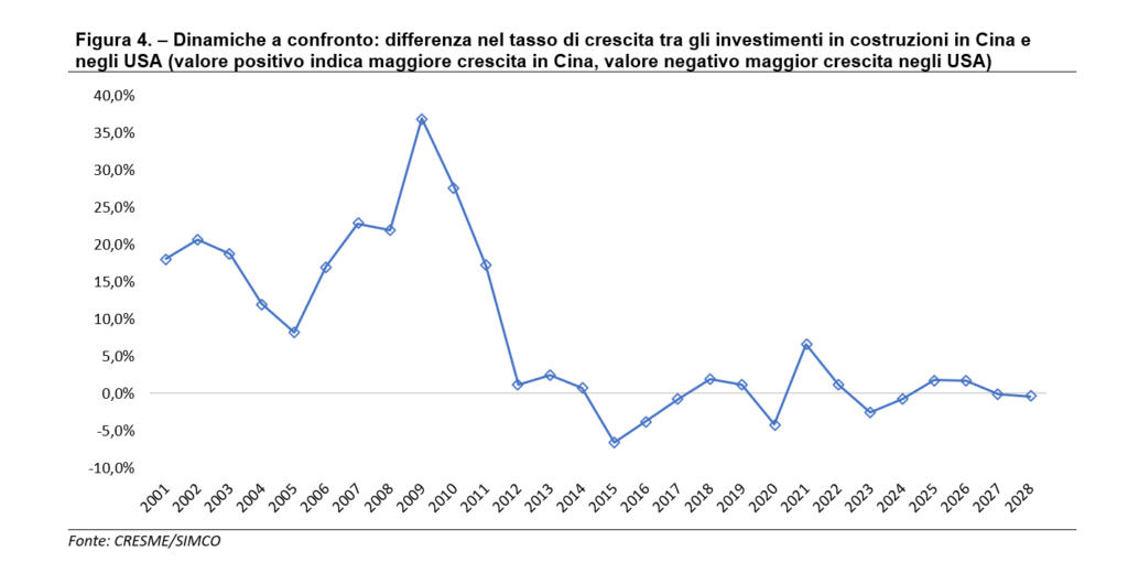 Un modo per misurare il ridimensionamento del settore delle costruzioni cinese è confrontarlo con le dinamiche del mercato statunitense. Analizzando i tassi di crescita annui degli investimenti si può osservare come il divario in favore di Pechino avesse raggiunto il massimo livello durante il culmine della crisi dei mutui subprime, nel 2009, quando il settore delle costruzioni trainava l’economia cinese, mentre il mercato statunitense era in forte contrazione. In seguito il divario si è gradualmente ridotto, e oggi può considerarsi praticamente azzerato (Figura 4). Va tenuto conto, tuttavia, che le previsioni attuali non tengono conto dei possibili effetti della politica espansiva di Donald Trump sul settore delle costruzioni. Per gli investimenti residenziali, interessanti opportunità potrebbero derivare da una combinazione di deregolamentazione, politiche fiscali accomodanti e riduzioni delle imposte. Gli obiettivi di rilocalizzazione della produzione e un aumento della domanda di prodotti “made in the USA”, spinti dall’aumento dei prezzi dei beni importati, potrebbero invece generare ricadute positive per le costruzioni non residenziali. Infine, considerando il ruolo centrale svolto dagli investimenti infrastrutturali all’interno dell’Agenda 47 di Trump, un’accelerazione della spesa capitale in opere pubbliche è probabile, soprattutto nei campi dell’energia e dei trasporti. Diversi elementi di criticità potrebbero tuttavia neutralizzare, parzialmente o completamente, gli effetti propulsivi legati all’implementazione delle politiche espansive annunciate. Eventuali picchi inflattivi potrebbero portare a un irrigidimento monetario, frenando nuovi investimenti e consumi. Nel medio termine, inoltre, c’è il rischio che le riforme regolatorie non vengano pienamente attuate a causa di inefficienze burocratiche e conflitti con le amministrazioni statali o locali, le quali potrebbero interferire in diversi modi, ad esempio, introducendo normative ambientali via via più stringenti.