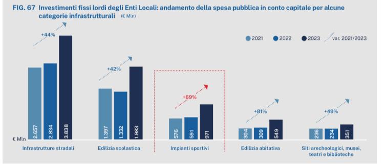 Gli investimenti nelle infrastrutture sportive vedono finalmente una luce in fondo al tunnel. Se negli ultimi cinque anni il sistema sportivo ha dovuto affrontare una serie di crisi multiple (dalla pandemia al caro-energia passando per il rialzo dei tassi d’interesse e dell’inflazione) che hanno messo a dura prova il settore, determinando un freno agli investimenti, a partire dal 2023 è arrivato un vero e proprio punto di svolta. Si tratta dell’anno, infatti, in cui lo sport ha attivato quasi 1 miliardo di euro di progetti, registrando una crescita a doppia cifra (+69% rispetto al 2021) superiore addirittura a quella di altri rilevanti segmenti infrastrutturali come i trasporti (+44%) e l’edilizia scolastica (+42%) (Fig. 67). L’impiantistica sportiva è arrivata, così, a rappresentare il 6,3% del valore totale degli investimenti fissi lordi realizzati dagli enti locali, grazie soprattutto alla spinta esercitata dalle risorse PNRR. La fotografia è stata scattata dall’ultimo Rapporto Sport 2024 presentato a Roma dall’Istituto per il Credito Sportivo e Culturale e Sport e Salute che ha evidenziato anche come il settore dello sport abbia ormai raggiunto in Italia una dimensione economica rilevante pari a 24,7 miliardi di euro nel 2022, in crescita del +12,6% rispetto all’anno precedente, con un contributo al PIL nazionale dell’1,38%. Nel 2022 la crescita del valore aggiunto rispetto all’anno precedente è stata addirittura superiore a quella registrata dal complesso dell’economia italiana (+12,6% rispetto a +6,8%). Sport che è in grado di agire da potente moltiplicatore di benefici per i territori e le comunità. Ogni euro investito in progetti sportivi riesce a generare mediamente oltre 4 euro di ritorni sociali, migliorando le “prestazioni” delle comunità su alcuni indicatori chiave, quali salute, occupazione, istruzione, lotta alla criminalità.