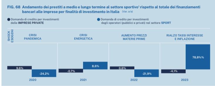 “In questo contesto congiunturale estremamente sfidante – si legge nel rapporto – nel settore sportivo la domanda di credito per finalità di investimento ha sperimentato una performance in controtendenza rispetto alla richiesta di finanziamenti a medio e lungo termine delle imprese italiane. Nel 2023, mentre la domanda di prestiti per investimento delle imprese si è contratta del 4,1%, il volume dei finanziamenti bancari destinati a progetti sportivi, su iniziativa pubblica e privata, è cresciuto a doppia cifra, ad un tasso del 79% a/a”. (Fig. 68).