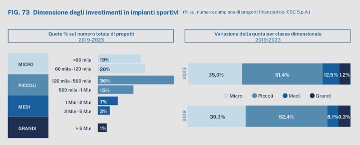 A prevalere sono i micro e piccoli investimenti (sotto i 500 mila euro), che assorbono il 90% delle iniziative avviate tra il 2019 e il 2023. E questo perchè da un lato i comuni ( che hanno anche la fetta maggiore della proprietà, con oltre il 70% degli impianti sportivi presenti sul territorio nazionale), dimostrano una migliore capacità realizzativa nel caso di opere di taglia finanziaria contenuta, (richiedono, infatti, minore sforzo progettuale e iter burocratici meno complessi), dall’altro, il numero preponderante di microimprese tende a orientare le scelte di investimento su piccoli interventi, in gran parte diretti a finalità di manutenzione e gestione ordinaria. Le iniziative di soglia finanziaria molto alta, sopra i 5 milioni di euro, continuano, invece, a rappresentare una quota marginale del portafoglio progetti, pari a poco più dell’1% sul totale degli interventi finanziati nel periodo 2019-2023.