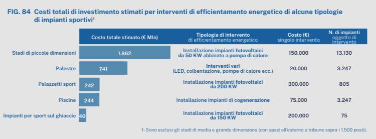 In base alle stime effettuate da Sport e Salute, il costo totale per l’efficientamento energetico degli impianti sportivi dovrebbe ammontare a circa 3 miliardi di euro (escludendo gli interventi di riqualificazione sui grandi stadi), di cui 1,3 miliardi per la riqualificazione di 40 mila strutture, tra piscine, palestre, palazzetti dello sport e palaghiaccio, e 1,9 miliardi per l’installazione di pannelli fotovoltaici su 12 mila stadi di piccola scala (Fig. 84).
