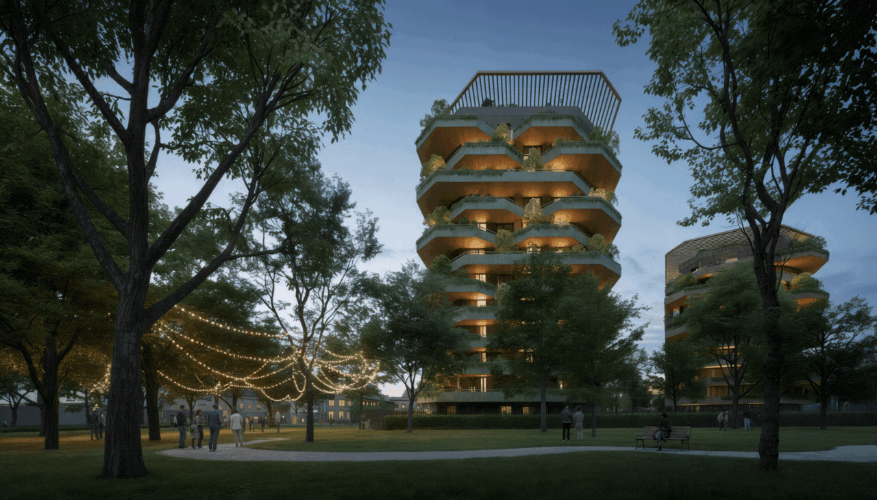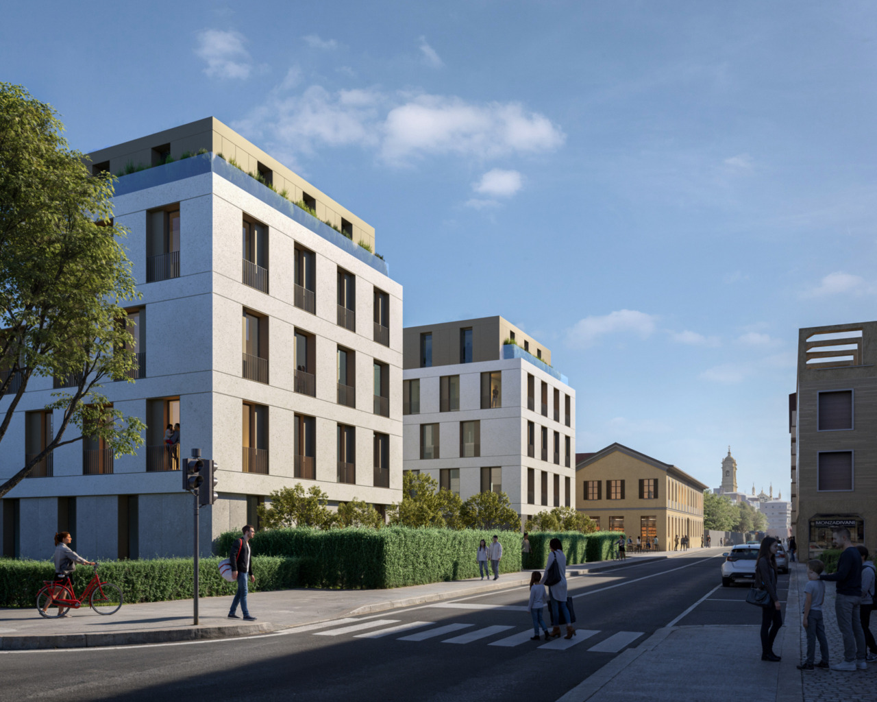 Il piano terra delle residenze è concepito come una vera e propria soglia tra città e spazio dell’abitare, con una lobby passante, ambienti per lo smart working, sala comune, palestra e parcheggi per biciclette. Funzioni che contribuiscono a generare un fronte urbano attivo, capace di creare continuità tra uso pubblico e residenziale. Anche la scelta cromatica richiama il paesaggio circostante, con toni del verde e sfumature terrose, mentre lo spazio tra i due edifici residenziali è pensato come un varco urbano che inquadra la torre del Duomo, stabilendo un collegamento visivo diretto con il centro storico.