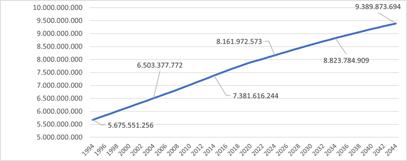 Grafico 1 La popolazione nel Mondo secondo l’ONU-1994-2024 Ipotesi centrale della previsione