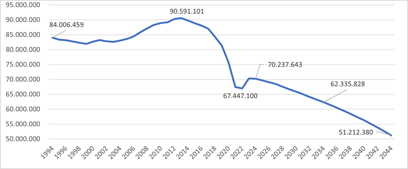 Nei prossimi venti anni (2024-2044) l’Europa, Russia compresa, si passerà da 745 milioni di abitanti a 711, trenta milioni di abitanti in meno: di questi 11,4 milioni sono dovuti alla perdita di popolazione dell’Europa del Sud, che comprende anche i Balcani, che passerà da 151 milioni di abitanti a meno di 140; di questi 11,4 milioni di abitanti in meno, 5,3 sono dovuti alla perdita di popolazione dell’Italia, che passerà da 59,3 a 55 milioni di abitanti. Altri 22,6 milioni di abitanti si perderanno nell’Europa dell’Est, e 2 milioni nell’Europa dell’Ovest. La sola area in crescita è il Nord Europa, che comprende la Gran Bretagna, che secondo la previsione crescerà in venti anni di 6 milioni di abitanti.