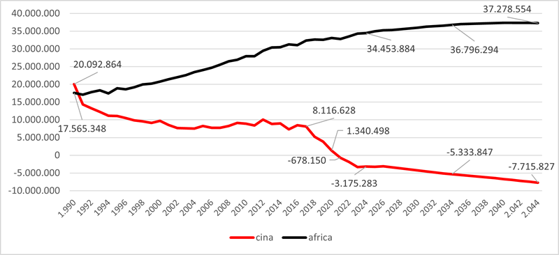 Grafico 3 La crescita annua della popolazione in Cina e in Africa secondo l’ONU-1994-2024-2044