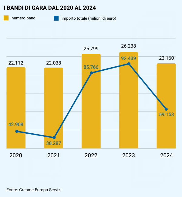 Nel 2024 procedure di appalto per 59 miliardi, -36% sul 2023 ma +55% sul livello 2021 pre-Pnrr