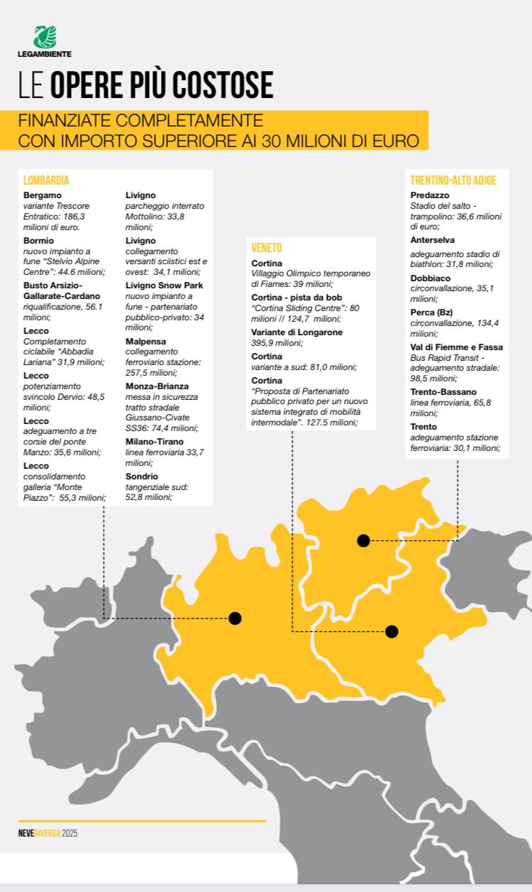 Olimpiadi invernali Milano-Cortina 2026. A meno di un anno dall’evento sportivo, la sostenibilità resta un obiettivo lontano, mentre continuano le difficoltà legate a opere faraoniche, ritardi e costi alle stelle. E ancora, Giochi Olimpici invernali partiti con un budget di 1,5 miliardi di euro ed arrivati, ad oggi, a toccare costi oltre i 5,7 miliardi di euro. Riguardo le opere previste, inoltre, molte rischiano di non essere completate, tra queste anche le varianti della Val Boite. Mentre resta alta l’incognita neve 2026. E’ questa, in sintesi, la fotografia scattata da Legambiente nel suo nuovo dossier Nevediversa 2025 “Una nuova montagna è possibile?” con il censimento aggiornato degli impianti legati agli sci tra chiusi, semichiusi e quelli che faticano a restare aperti e, appunto, un focus sulle Olimpiadi invernali. Milano-Cortina 2026, insomma, continua a essere un percorso accidentato, tra colpi di scena, ripensamenti e scelte discutibili. “Dal 2019 ad oggi – si legge nelrapporto – le cronache hanno riportato le numerose difficoltà per l’organizzazione dell’evento: ritardi sia nei progetti che nell’avvio dei lavori, costi in aumento ed extra-costi, gare deserte e offerte di impianti proposti oltre confine, soluzioni logistiche di ripiego, optando per strutture più ‘light’, cantieri che ancora non sono aperti e che, con molta probabilità, verranno completati a Olimpiadi concluse. Una situazione che rischia di lasciare un’eredità pesante per i territori coinvolti e per le casse pubbliche”.