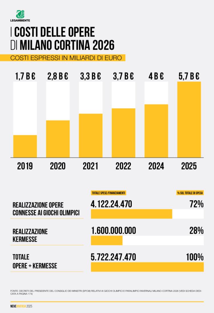 I costi per le Olimpiadi sono cresciuti esponenzialmente, con un incremento di molti miliardi di euro rispetto alle previsioni iniziali. La maggior parte delle spese riguarda opere infrastrutturali di trasporto – strade, ferrovie e aeroporti – molte delle quali rischiano di non essere completate in tempo per i Giochi. “Un esempio emblematico è la nuova pista di bob e slittino di Cortina: demolire (e non ristrutturare la vecchia pista, come inizialmente era previsto nel dossier di candidatura) e ricostruire l’impianto ha fatto lievitare il costo da una stima iniziale di 50 milioni a oltre 128 milioni di euro. Resta inoltre l’incognita sulla gestione della struttura dopo i Giochi, alimentando dubbi sulla sua reale utilità”, sottolinea l’associazione ambientalista. Lo stesso Thomas Bach, presidente del Cio, dichiara che quella di Cortina sarà l’ultima pista da bob ad essere costruita nel mondo.