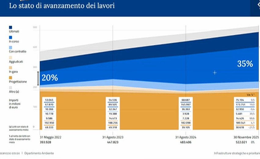 Il Servizio studi della Camera ha presentato ieri alla commissione Ambiente di Montecitorio il Rapporto annuale sulle opere strategiche e prioritarie 2025, realizzato in collaborazione con Cresme e Anac, con dati aggiornati a novembre 2025. I dati salienti sono stati esposti dal direttore del Cresme, Lorenzo Bellicini, che ha evidenziato in particolare la crescita dei costi del totale delle opere, passati dai 483 miliardi di euro di agosto 2024 (precedente rilevazione) a 522 miliardi (+8%), la crescita dei lavori ultimati (+9,5%), arrivati alla cifra di 75 miliardi e la crescita dei lavori in corso (+19%) che hanno toccato i 174 miliardi. Bellicini ha spiegato che, in assenza di un rilevante allargamento del perimetro del programma di opere (si è aggiunta soltanto la diga di Vetto nell’Appennino Reggiano per un costo di 519 milioni), la lievitazione dei costi è stata determinata da due fattori: l’avanzamento dei lavori e le variazioni prezzi.