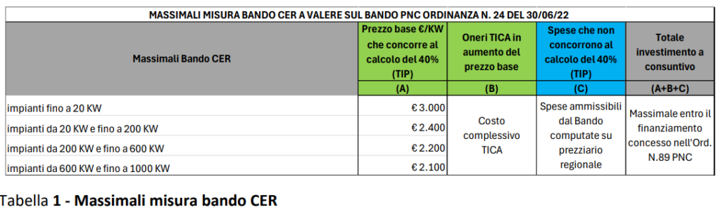 “L’elenco delle spese ammissibili del Bando CER è stato suddiviso in due sezioni: i. Elenco delle spese che contribuiscono al calcolo del contributo in conto capitale fino al 40% (ai fini dell’accesso alla TIP); ii. Elenco delle spese che non contribuiscono al calcolo del contributo in conto capitale fino al 40% (ai fini dell’accesso alla TIP)”, si legge al paragrafo 8 del nuovo documento. “Tutte le spese ammissibili dovranno essere computate in base ai prezzari regionali di riferimento, ma per la prima sezione, (ovvero le spese che contribuiscono al calcolo del contributo in conto capitale fino al 40%), si dovrà rispettare il prezzo di riferimento massimo, espresso in €/KW, indicato nell’allegato”.
