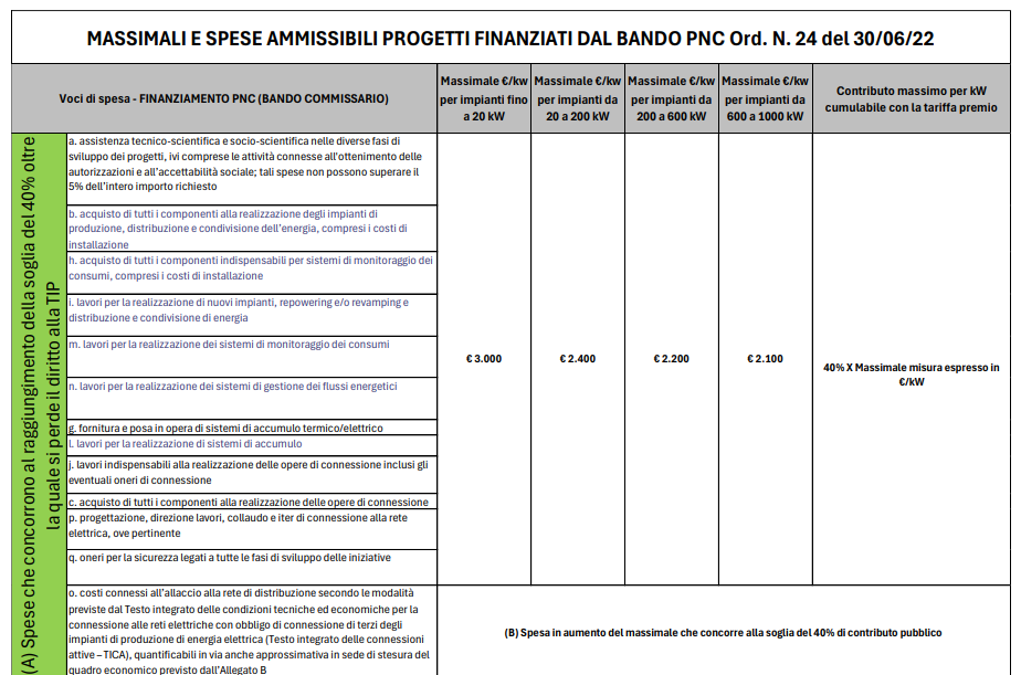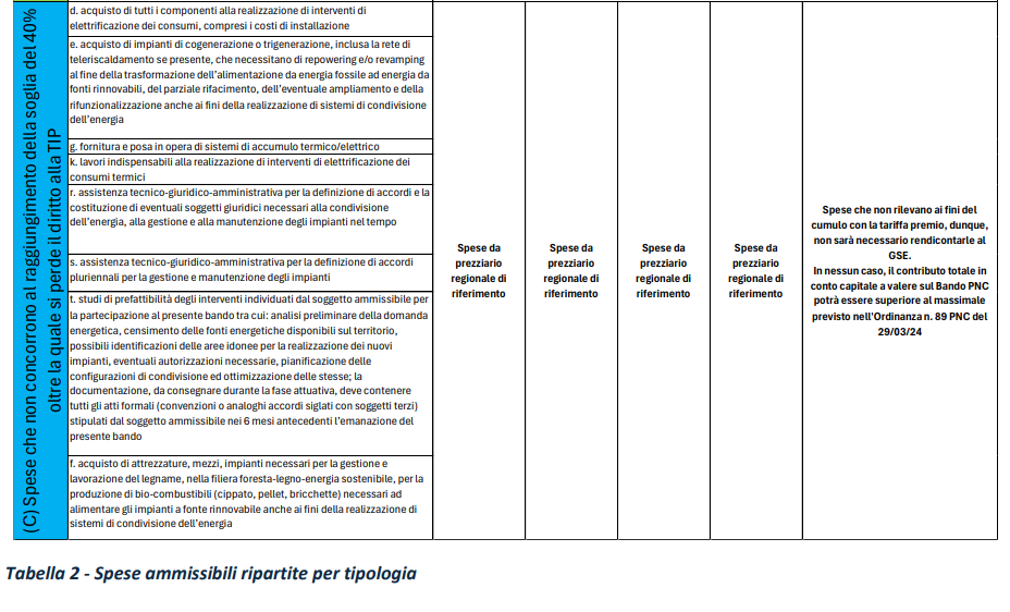 “I massimali specificati sono applicabili indipendentemente dalla modalità di realizzazione del progetto, sia essa appalto o Partenariato Pubblico-Privato, e non sono influenzati dall’entità del contributo pubblico in conto capitale ottenuto, né dalla richiesta di accesso alla Tariffa Incentivante Premiale (TIP) al GSE. Per una maggiore comprensione, tutte le spese ammissibili, come definite all’Art. 5 del bando CER, sono categorizzate in tre gruppi distinti nella Tabella 2: A) Spese che concorrono al calcolo del contributo, fino al 40%, oltre il quale si perde il diritto di