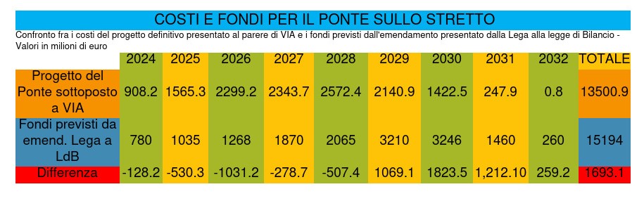 Dal confronto fra la spesa prevista dal progetto definitivo e i fondi che sarebbero resi disponibili dall’emendamento Lega-Salvini alla legge di bilancio si evidenzia come ci sia un rallentamento rispetto ai programmi fino al 2028 e poi una forte accelerazione dal 2029 al 2032. Se passa la proposta leghista, la grande opera avrà comunque 3.564 milioni di euro rispetto agli stanziamenti attuali, con una “riserva” di 1.693 milioni rispetto ai costi preventivati.