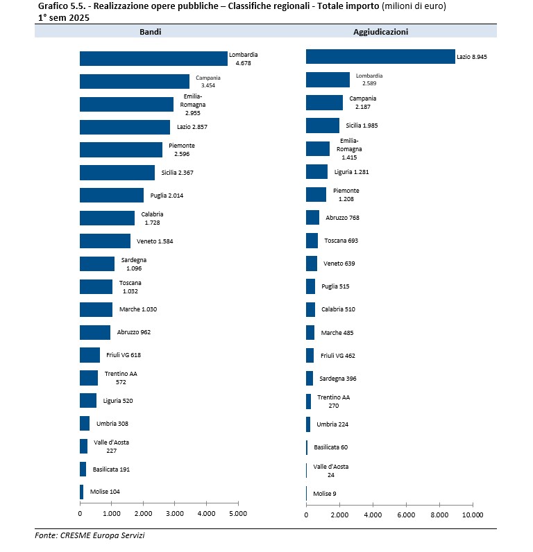 Sul piano territoriale, a guidare la classifica dei bandi è la Lombardia (4.678 milioni di euro), seguita da Campania (3.454 milioni) ed Emilia-Romagna (2.955 milioni). Per le aggiudicazioni vince il Lazio con 8.945 milioni, seguita dalla Lombardia (2.589 milioni) e dalla  Campania (1.985 milioni). Qui in basso il grafico con i valori di tutte le regioni.