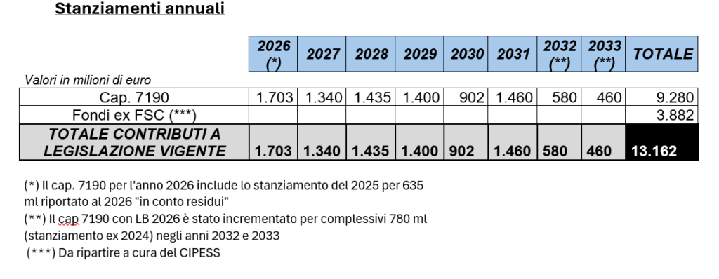 La tabella aggiornata degli stanziamenti annuali conferma che non c’è rallentamento (a parte la CdC). L’opera, come tutti i programmi, dovrà superare l’esame di conferma dei 6,2 miliardi FSC che contribuiscono al quadro finanziario.