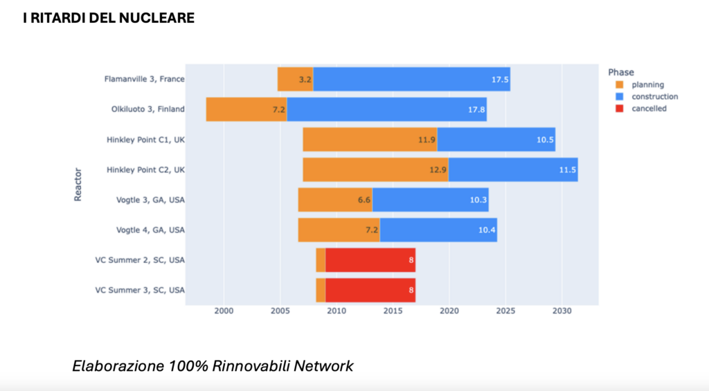Non va, invece, la spinta proattiva del governo sul nuovo nucleare. Secondo lo studio, sono cinque le ragioni principali a spiegarlo. Anzitutto, il declino di questa tecnologia: dopo il picco, circa il 17% della produzione elettrica mondiale, raggiunto al termine del secolo scorso, è iniziato un trend discendente, che ha portato il contributo del nucleare a calare fino al 9,2% nel 2022. Oggi, poi, questa tecnologia presenta costi molto elevati e tempi di costruzione lunghissimi, come dimostrano le esperienze di Flamanville in Francia, Olkiluoto in Finlandia e Hinkley Point in Gran Bretagna.