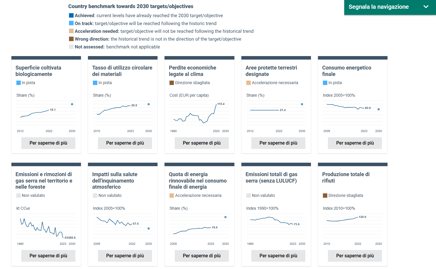 Le emissioni di gas serra sono in calo dal 1995 ma settori come il civile (edifici), i trasporti, i rifiuti, le piccole industrie e l’agricoltura probabilmente non raggiungeranno il target del 43,7% di riduzione di inquinamento al 2030, fermandosi al 41%. Ulteriori sfide sono legate alla qualità dell’aria e al rapporto tra perdite economiche ed eventi climatici estremi. Bene, invece, l’espansione dell’agricoltura biologica in linea con il piano strategico nazionale per la politica agricola comune e la strategia “dal produttore al consumatore”.