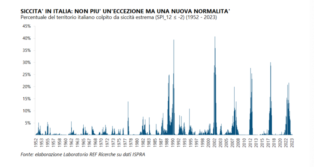 Andando a sviscerare il problema, Ref spiega che il trend siccitoso è in atto da cinquant’anni in Italia e in Europa. Nel Vecchio Continente, in queste decadi il fabbisogno idrico è andato crescendo a fronte di una conseguente diminuzione pro capite, pari al 24%, delle risorse di acque rinnovabili. Le cause di questa situazione sono il cambiamento climatico (e i suoi effetti: un generalizzato aumento delle temperature e una sempre più evidente alterazione dei modelli meteorologici) e la domanda crescente di acqua. Su entrambe, dice Ref, l’Italia “è una delle aree del continente in cui questi effetti sono più evidenti, essendo sottoposta a rischi maggiori in termini di eventi siccitosi, frequenza delle ondate di calore e cambio del regime delle precipitazioni: meno frequenti, più abbondanti e concentrate nello spazio”. Se guardiamo solo agli ultimi vent’anni, la siccità ha interessato il 120% del territorio nazionale rispetto a quanto avveniva nei cinquant’anni addietro. E dal 2000 ad oggi sono stati almeno quattro gli eventi siccitosi: 2002, 2012, 2017 e 2022. Tre su quattro nell’ultima decade. Una nuova normalità, la chiama Ref, quella che riguarda l’Italia.