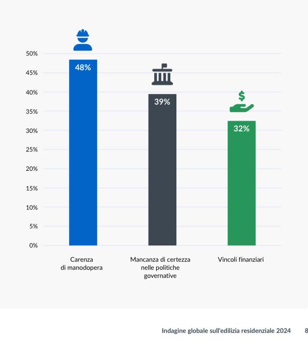 Tuttavia, a questa ripresa della domanda non corrisponde altrettanta capacità di offerta da parte del settore. Vincoli finanziari, carenza di manodopera e ostacoli normativi continuano a mettere a dura prova le tempistiche e i budget dei progetti, rendendo difficile per i costruttori edili tenere il passo con le esigenze del mercato. Questo scollamento tra la domanda e la capacità di soddisfarla evidenzia le criticità che devono essere affrontate per sostenere la crescita.