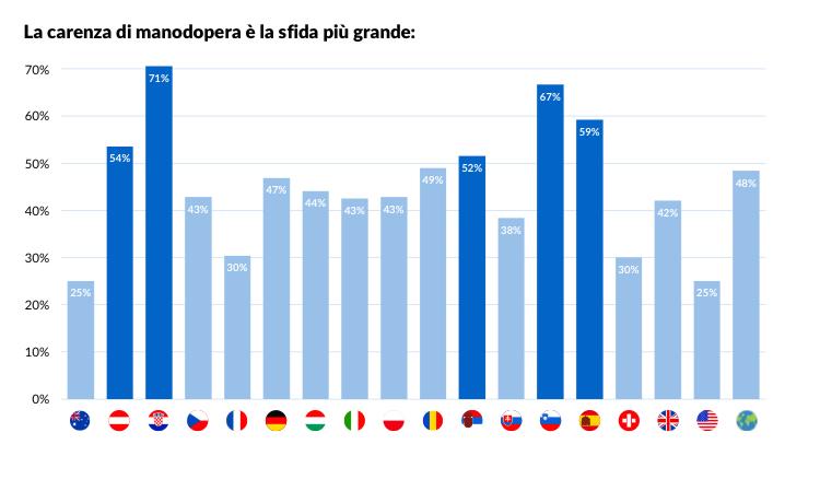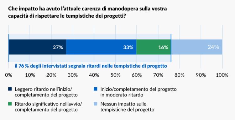 In particolare l’indagine evidenzia che la carenza di manodopera è la sfida principale per i costruttori e contribuisce in modo significativo all’aumento dei costi, con quasi due terzi degli intervistati che dichiara di dover affrontare aumenti salariali, e oltre il 75% che cita ritardi nei progetti per lo stesso motivo, con una conseguente riduzione della produttività. L’effetto a catena della carenza di manodopera è evidente nelle risposte relative all’impatto sulle tempistiche dei progetti. In tutti i Paesi, almeno il 50 % degli intervistati ha riportato effetti negativi, sottolineando la natura diffusa di questo problema. L’impatto sull’efficacia e sull’efficienza dei progetti “rivela l’urgente e pressante necessità di affrontare le questioni di fondo e migliorare le condizioni del mercato del lavoro”, si legge.