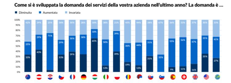 Ciò che emerge, in maniera evidente, è la preoccupazione dei costruttori edili per l’andamento del comparto residenziale, con quasi l’80% degli intervistati attualmente sotto pressione a causa dell’aumento dei costi. In Italia, questa percentuale si attesta invece al 65%: oltre un terzo dei costruttori italiani ha infatti dichiarato che i costi sono rimasti invariati, il secondo valore più alto tra tutti i Paesi intervistati.