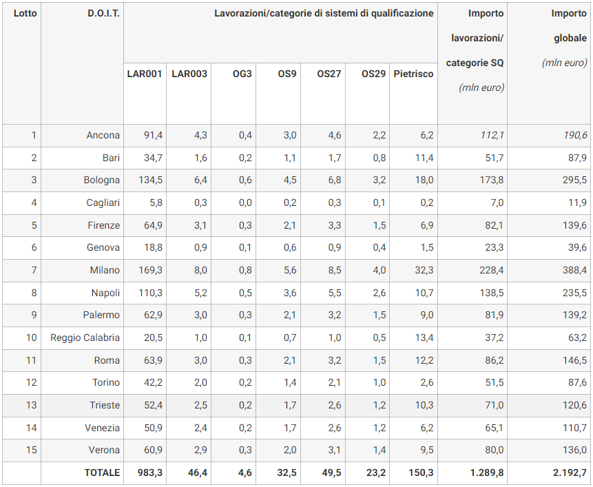 Il valore globale massimo degli accordi quadro in gara ammonta a 2.192.717.609,60 euro ed è suddiviso nei seguenti 15 lotti, uno per ogni direzione operativa infrastrutture territoriale (D.O.I.T).