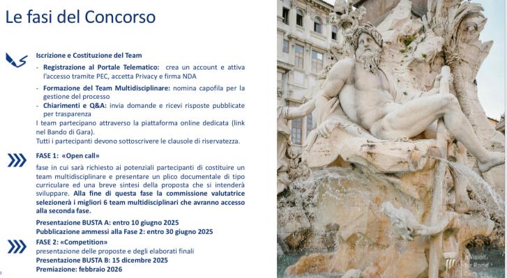 La Fondazione creata da tre sviluppatori immobiliari, DeA Capital Re sgr, Investire sgr e Fabrica Immobiliare sgr,  chiama a raccolta le eccellenze multidisciplinari romane, italiane e internazionali, per re-immaginare la Capitale nei prossimi anni. Si cercano soluzioni e proposte per costruire una banca dati di progetti innovativi sulla rigenerazione urbana. Primo premio di 130mila euro, rimborso di 70mila euro per il secondo classificato, gettoni da 25mila euro ciascuno ai classificati dal terzo al sesto posto. Termine per la candidatura alla prima fase fissata al 10 giugno: i sei migliori team saranno poi invitati partecipare alla gara vera e propria con consegna dei progetti entro il 15 dicembre 2025.