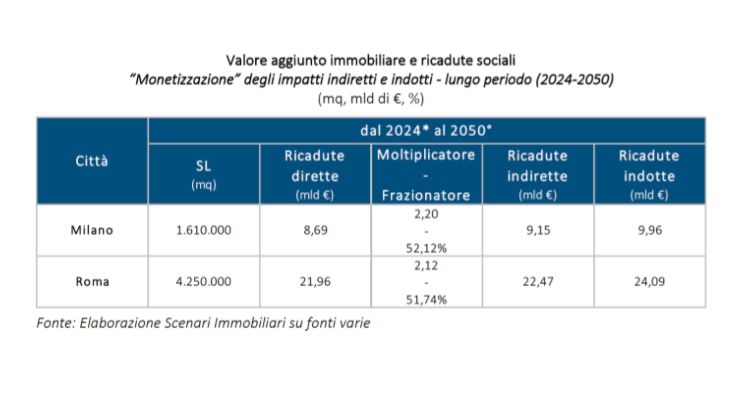 In particolare, nei prossimi 25 anni, le operazioni che andranno rinnovare e riqualificare il tessuto urbano milanese e romano, secondo quanto stimato nell’ultimo report “Rigenerazione – focus Milano e Roma”, realizzato da Scenari Immobiliari in collaborazione con Urban UP – Unipol, potranno apportare un valore aggiunto immobiliare complessivamente superiore ai 30 miliardi di euro, con 31,5 miliardi di euro (oltre 9 a Milano e più di 22 a Roma) gli impatti indiretti e 34 miliardi (10 a Milano e 24 a Roma) le ricadute indotte che andranno a interessare le comunità locali.
