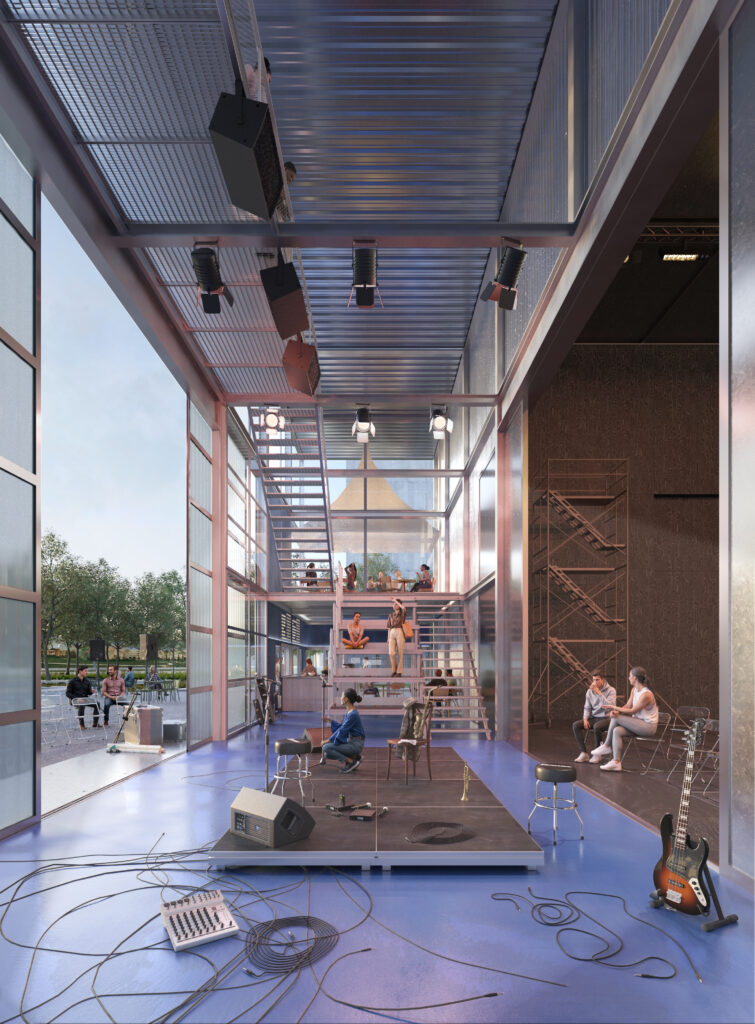 Il ‘Palco urbano’, con spazi di incontro, socializzazione e relazione (foyer, bar, ristorante, percorsi espositivi/didattici). Un luogo, insomma, per eventi, per il tempo libero per la socializzazione e per la creazione spontanea. I volumi che contengono queste attività realizzati con una griglia di travi, pilastri e solai metallici a vista, appaiono come grandi impalcature, palchi metallici temporanei e versatili di forme espressive più libere ed improvvisate.