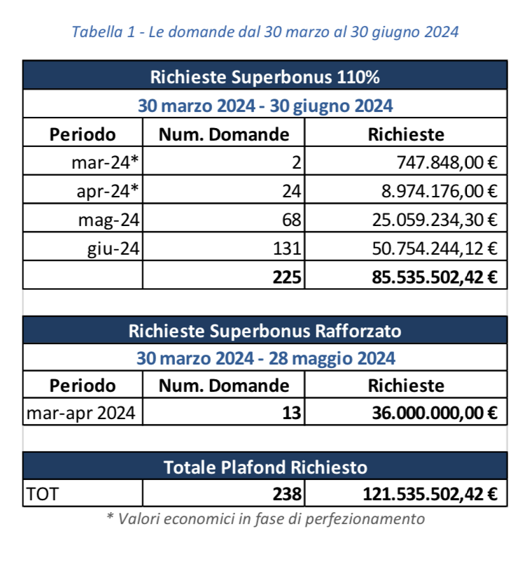 Prendendo in esame la panoramica generale: dal 30 marzo del 2024 sono state 225 le richieste di contributo (rcr) legate all’utilizzo del Superbonus 110% nella ricostruzione privata, legate all’opzione di cessione del credito e sconto in fattura, con importi richiesti di oltre 85,5 milioni di euro. A queste si aggiungono 13 domande di Superbonus rafforzato per un valore di 36 milioni pervenute durante il periodo di conversione in legge del DL 39/2024 e quindi prima dell’eliminazione di questa fattispecie. Al 30 giugno 2024 sono pervenute complessivamente 238 domande per un valore di 121,5 milioni di euro.