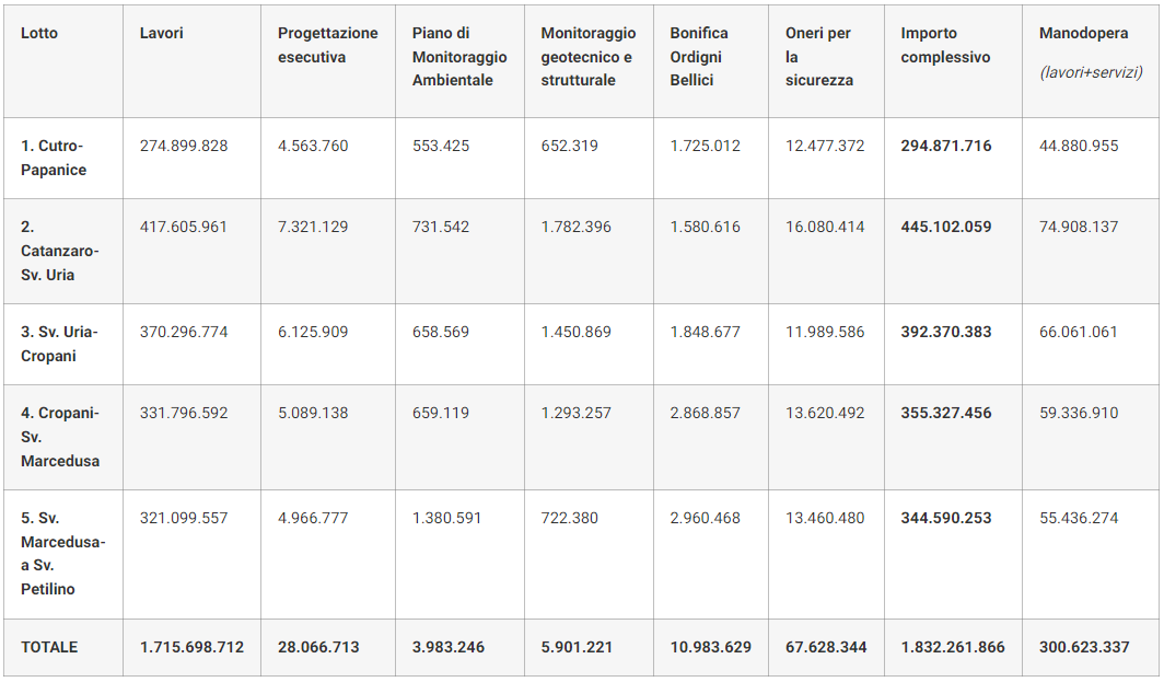 - esecuzione dei lavori – 1.210 giorni per il lotto 1; 1.295 giorni per il lotto 2; 1.250 giorni per il lotto 3; 1.400 giorni per il lotto 4; 2.030 giorni per il lotto 5.