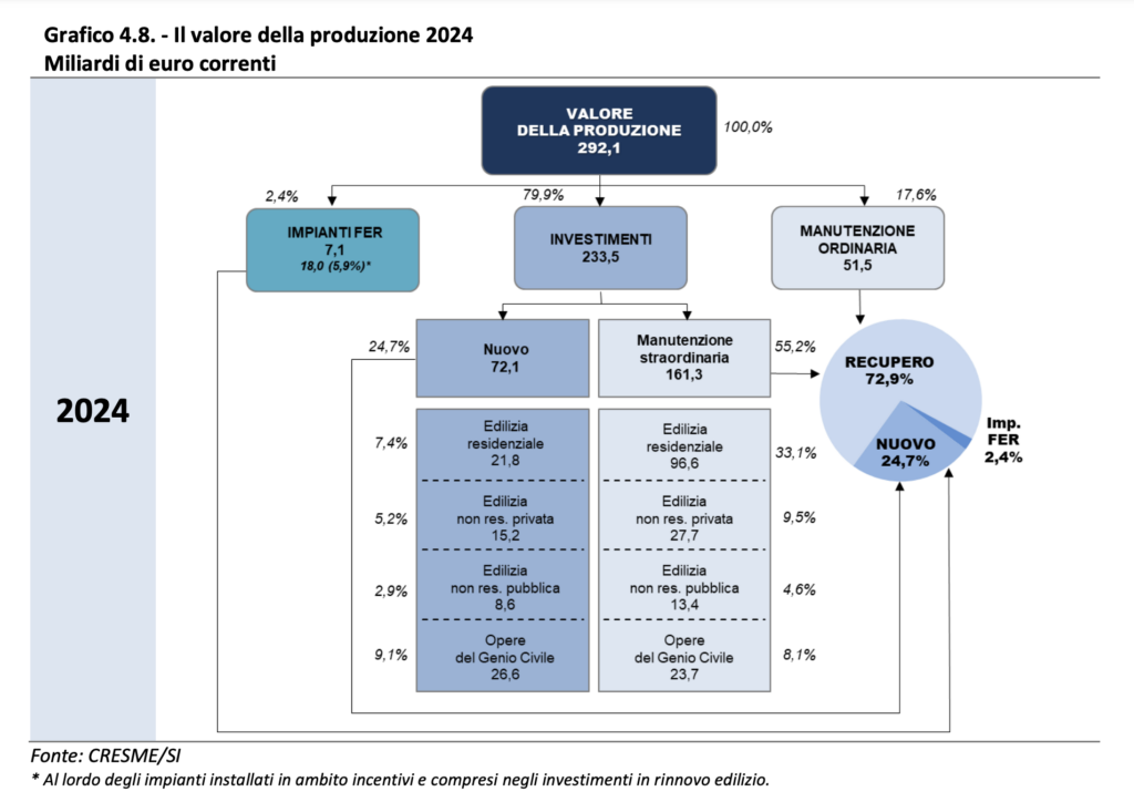 C’è il valore del mercato delle costruzioni che dal 2023 al 2024 è sceso del 6% da 311 a 292 miliardi di euro. E, all’interno, c’è il valore della manutenzione ordinaria per tutti i settori edilizi: 51,5 miliardi di euro quest’anno, con un +0,4% rispetto a quello passato.