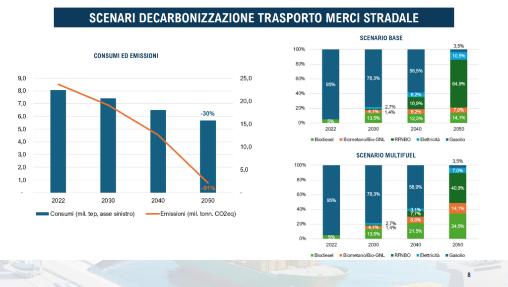 Partendo da quello stradale, si osserva che i consumi crolleranno del 30% al 2050 e le emissioni sono previste in calo del 91% entro metà secolo. Nel primo scenario, però, il gasolio conserverà una quota di ben il 58,5% al 2040 a fronte di percentuali ben più basse di biodiesel, biometano, Rfnb e ricarica elettrica. Poco cambia nello scenario multifuel, poiché al 2040 dovrebbero crescere soltanto i biocarburanti a scapito però non del gasolio bensì delle altre fonti green. Al 2050, invece, in entrambi i casi è prevista una prevalenza dei carburanti verdi.