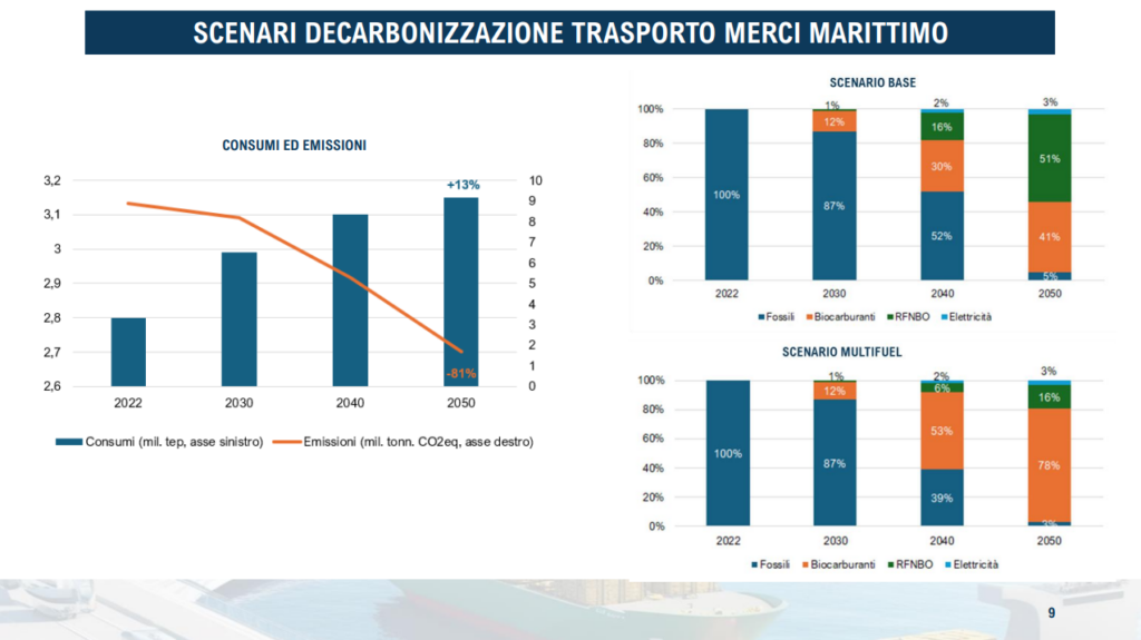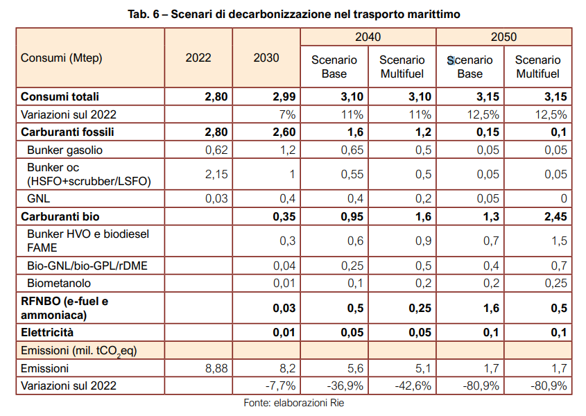 Guardando più da vicino il mondo del trasporto merci via mare, poi, il report afferma che i consumi potranno “mostrare una lieve crescita arrivando nel 2050 a raggiungere un livello prossimo a 3,15 mil. tep rispetto ai 2,8 mil. tep del 2022 (+12,5%)”. Al 2030, invece, la composizione del mix tecnologico rimarrà molto simile a quello attuale.